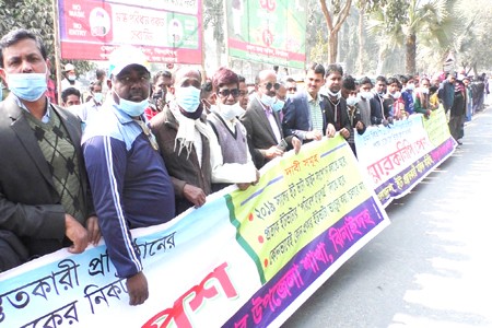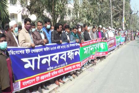 স্টাফ রিপোর্টার, ঝিনাইদহঃ ৩ দফা দাবীতে ঝিনাইদহে মানববন্ধন কর্মসূচী পালন করেছে ইটভাটা মালিক ও শ্রমিকরা। বৃহস্পতিবার সকালে ঝিনাইদহ-চুয়াডাঙ্গা মহাসড়কের জেলা প্রশাসকের কার্যালয়ে সামনে তারা এই কর্মসূচী পালন করে। এতে ব্যানার